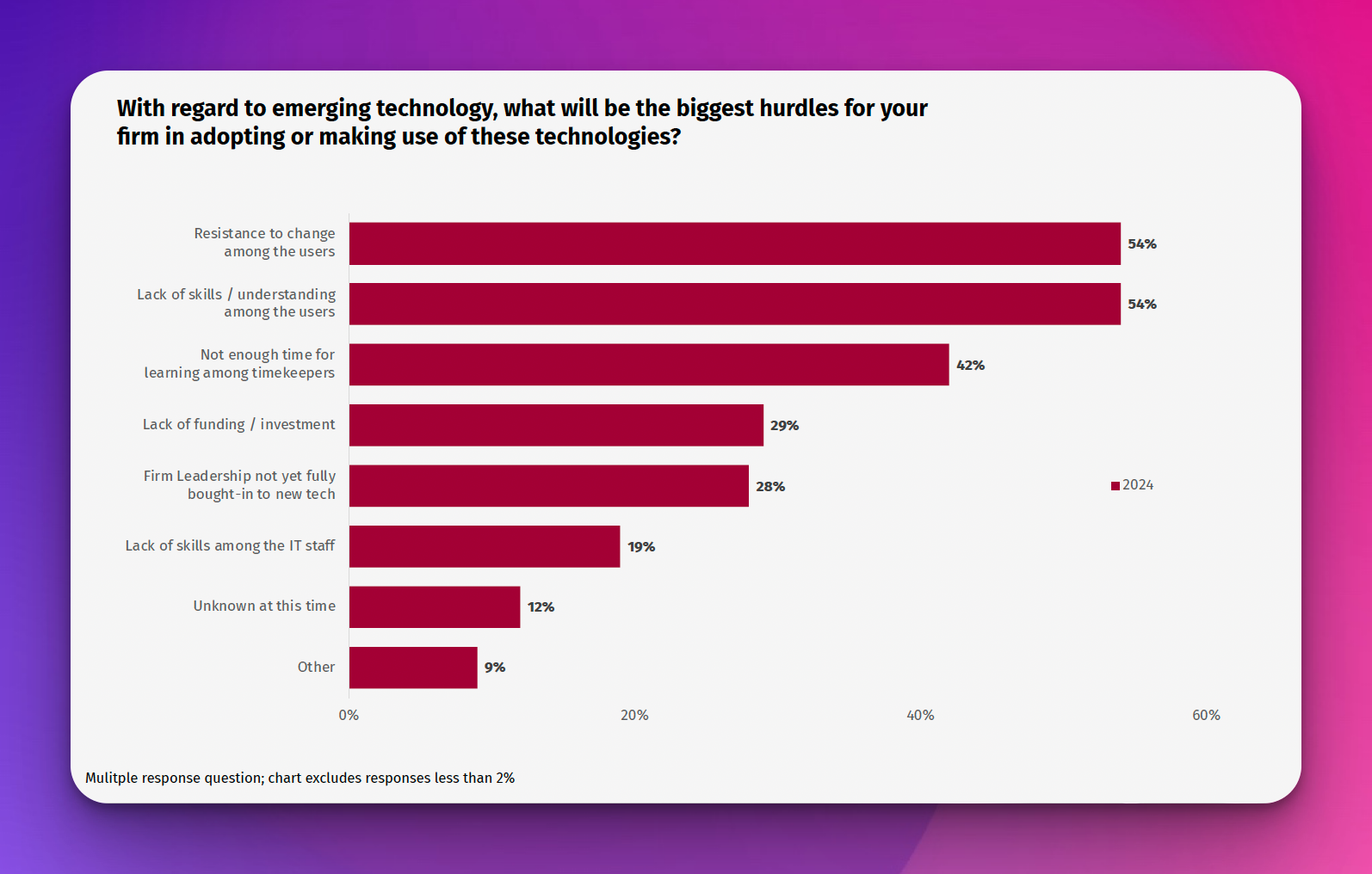 This indicates that even when technology is available, firms struggle to implement it effectively due to cultural challenges and a lack of proper training. These issues are compounded by a lack of time for learning, with 42% of respondents noting that timekeepers do not have enough time to train on new systems.