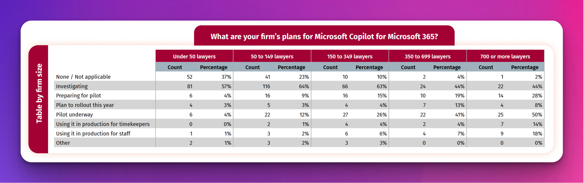 Generative AI (GenAI) tools, such as Microsoft Copilot, are increasingly being implemented across law firms, but the survey reveals a clear gap in adoption between larger and smaller firms.