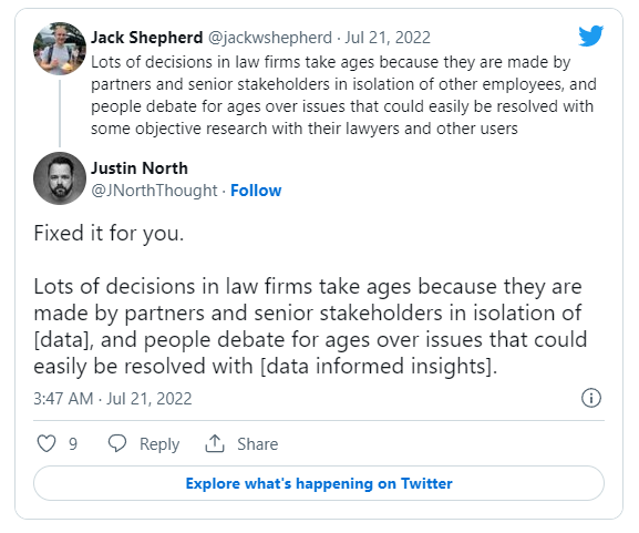 - Too many decisions in law firms are made in isolation. Good tweet from Jack Shepherd, and I like Justin North’s take on it: