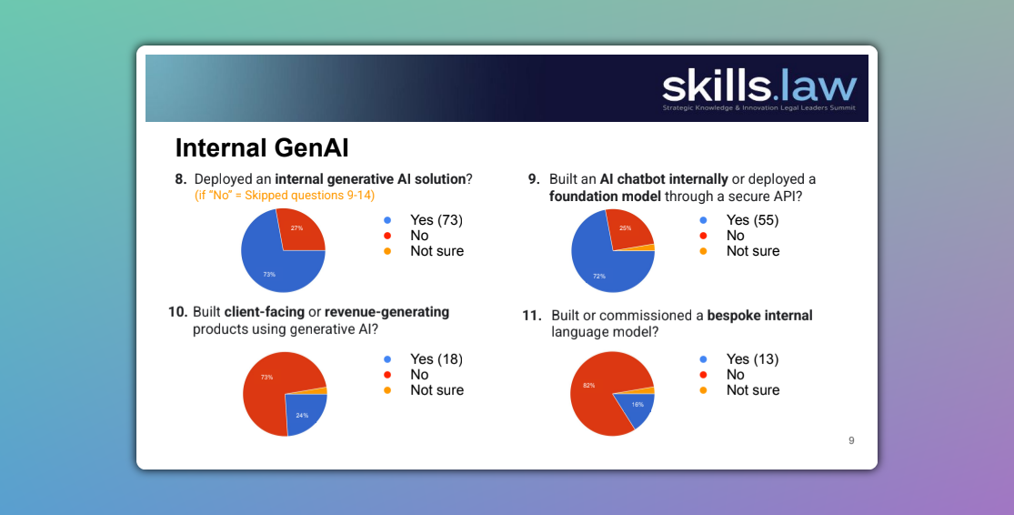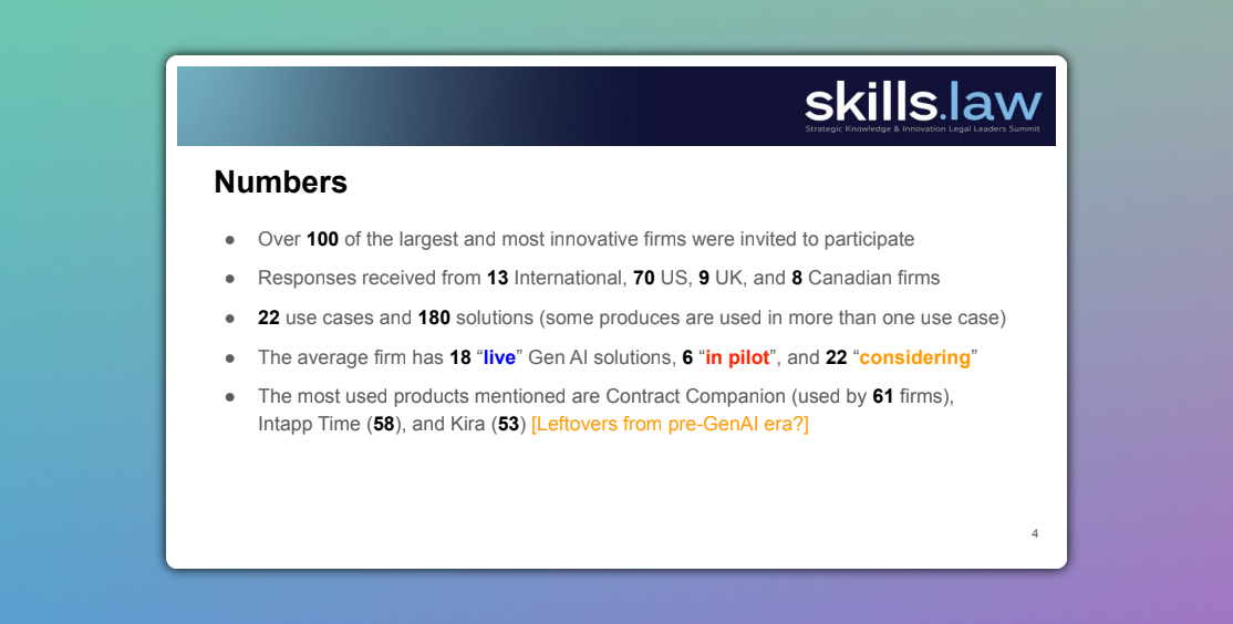 Presented by Oz Benamram, who leads the Strategic Knowledge & Innovation Legal Leaders Summit (SKILLS), the survey gathered responses from over 100 knowledge and innovation leaders at major law firms in early 2025. The results, shared at the SKILLS Summit, show important trends in tool adoption, strategic planning, and the evolving role of innovation teams.