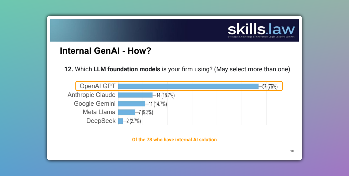 - Which LLMs Are in Use: The survey also asked which foundation models firms are using (multiple selections allowed). Unsurprisingly, OpenAI’s GPT family was among the most widely used, with many firms also experimenting with Anthropic’s Claude, and some looking at upcoming models like Google’s Gemini and Meta’s Llama. The takeaway is that OpenAI currently leads the pack as the go-to LLM provider for law firms, but alternatives are on the radar. Firms don’t want to be overly dependent on one AI platform, especially with the rapid evolution in this space.