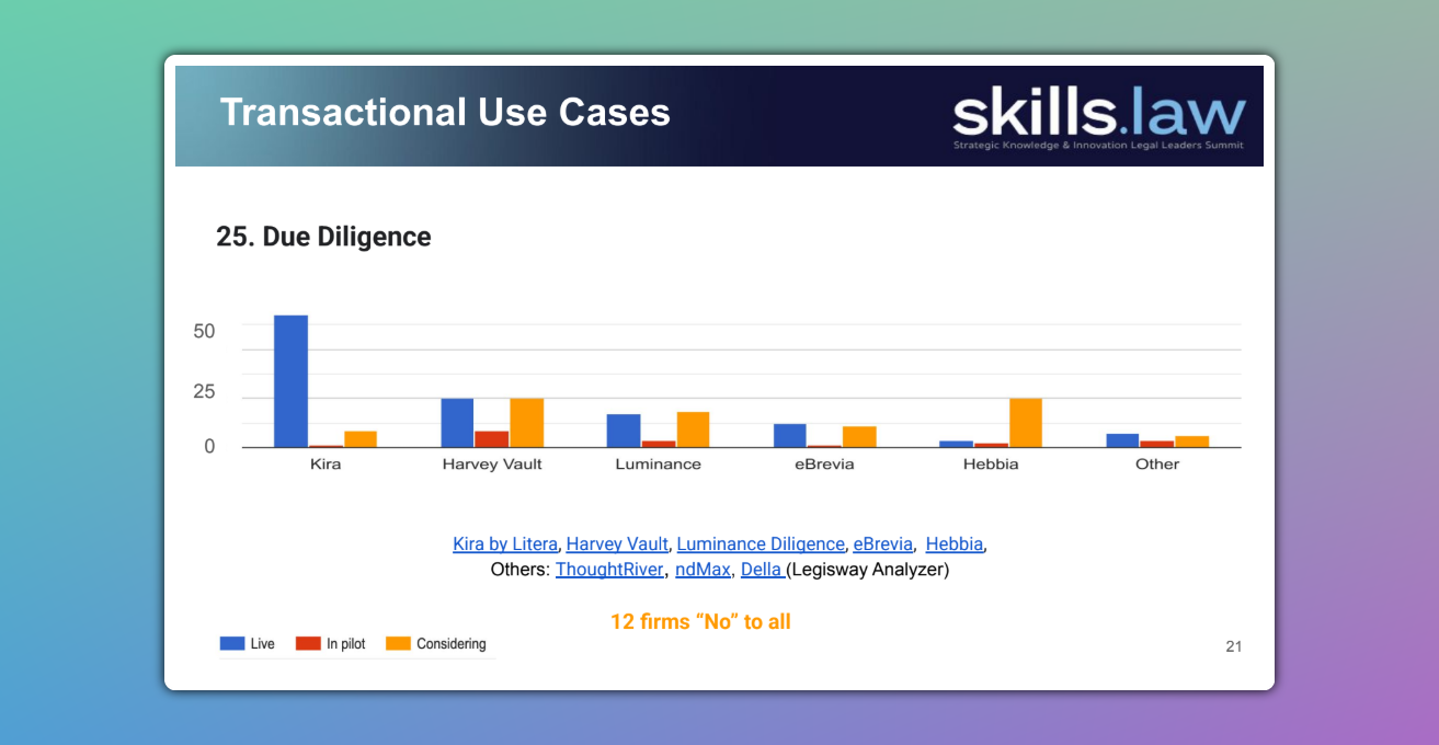 The SKILLS Summit organizers invited over 100 of the largest and most innovative law firms globally to participate, and received responses from a mix of U.S., UK, Canadian, and international firms. This cohort represents many of the firms at the forefront of legal tech innovation. The survey, conducted in Q1 2025, asked detailed questions about generative AI use cases and solutions in use at these firms. In total, respondents reported on 22 use case categories and around 180 unique AI products (since many tools appear in multiple use cases).